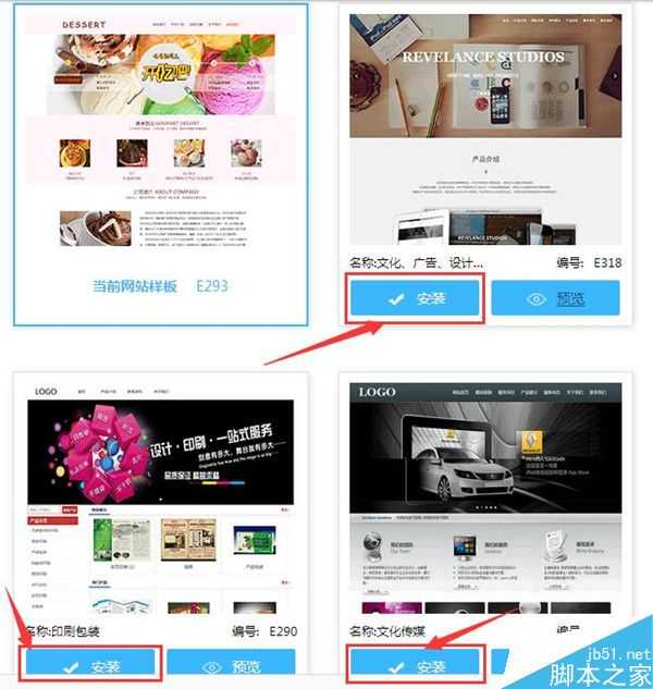 第二步、进入编辑页面,安装样板网站。样板网站是建站公司已经做好的漂亮网站,挑选一个你喜欢的进行安装,只需要更换样板网站图片和文章即能完成网站,非常快速简单。
