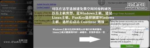 之后跳转到如下页面,显示的无非就是免费空间容量10GB,月流量300GB,可同时建立10个MySQL数据库和一个MSSQL数据库,下面那个 Tell us about your domain 选择第一项,自行设置域名的解析,否则会自动将主域名解析到这个免费空间上。