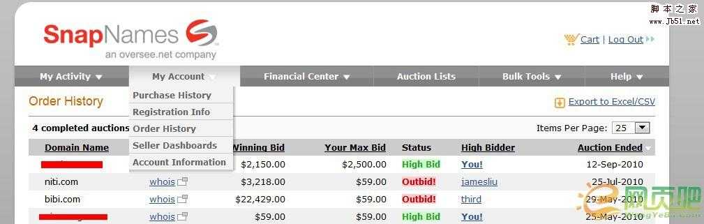 第五步:竞价成功。竞价成功后系统会自动给您开设一个账号,账号的名称和密码都是随机的,会直接发送到您的邮箱里面。您可以push进自己的主账号,也可以在60天后申请转移密码来转移到别的注册商。如下图,绿色表明您是最高出价者,就成功了: