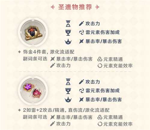 神子的圣遗物可以选择饰金四件、2如雷+2攻击或2+2攻击等不同的组合。如果想要运用激化流神子,建议选择饰金套装、2如雷+2精通组合,并在主词条中选择攻击沙、雷元素伤害的杯子和暴击/暴伤头饰,副词条可以选择双暴、攻击和元素精通。如果选择直伤流神子,则应该选择2+2攻击与2如雷+2攻击的组合,并在主词条中选择与激化流神子相同的属性,但在副词条中不需要特意堆叠元素精通。如果是纯雷队,则可选择平雷四件套装。